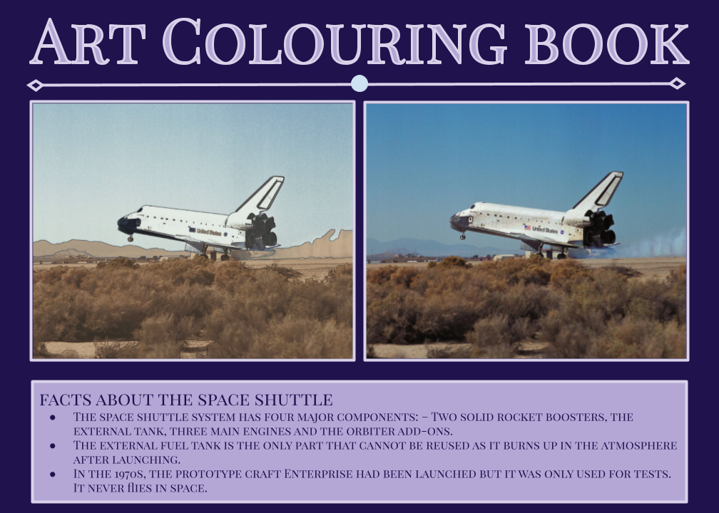 This was the teaser activity fro the Summer Learning Journey, the activity was the Art Colouring Book but NASA edition, I chose the space shuttle because it was easy but also hard to pick the color that matches with the image. After coloring the image in, i wrote three facts about the space shuttle.